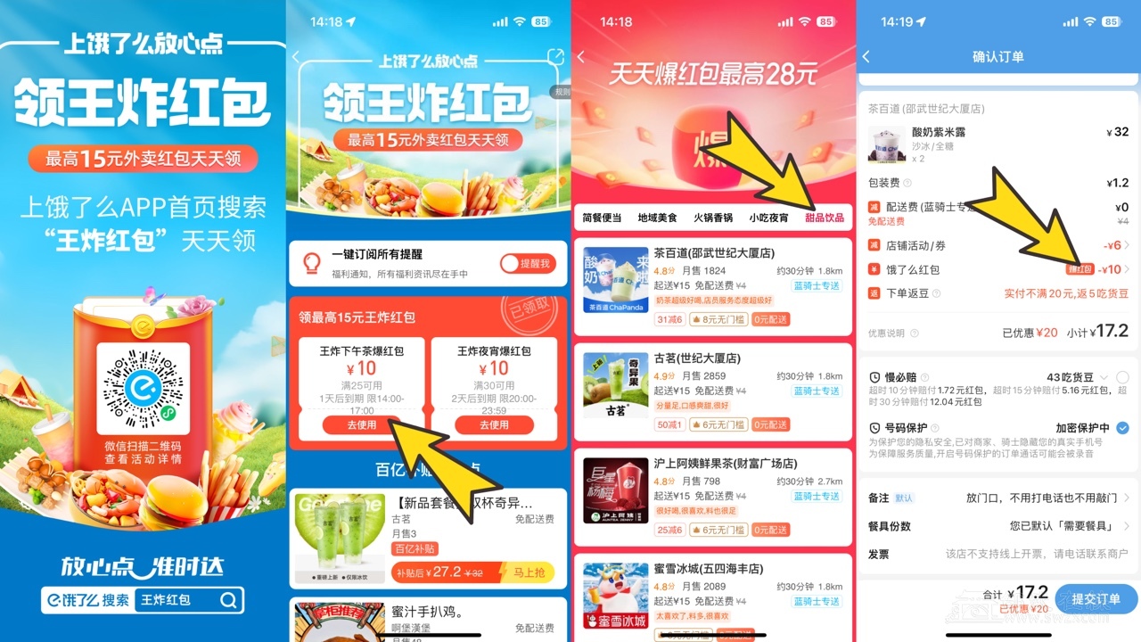 µÚÒ»²½£º´ò¿ª¶öÁËôAPPËÑË÷¡°ÍõÕ¨ºì°ü¡±»òÕß΢ÐÅɨÂëÁìÈ¡ÏÂÎç²èÂú25-10Ôª£¨14µã-17µã£©ºÍÒ¹ÏüÂú30-10Ôª£¨20µã-23µã59·Ö£©ºì°ü£¬ÐÂÓû§×î¸ß¿ÉÁì15Ôªºì°ü£¬²»ÐèÒª»áÔ±£¬É¨Âë»òËÑË÷¼´¿ÉÁìÈ¡