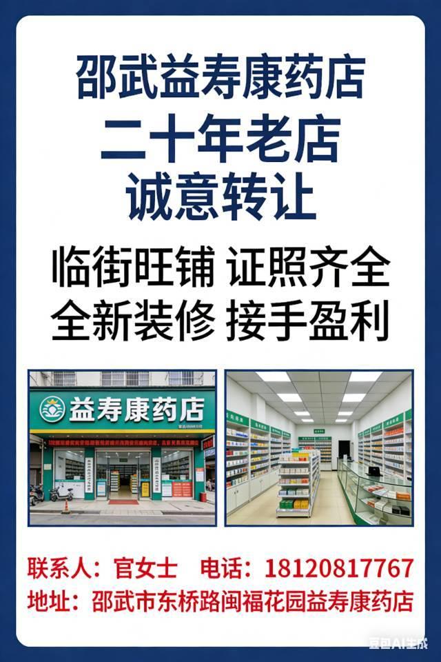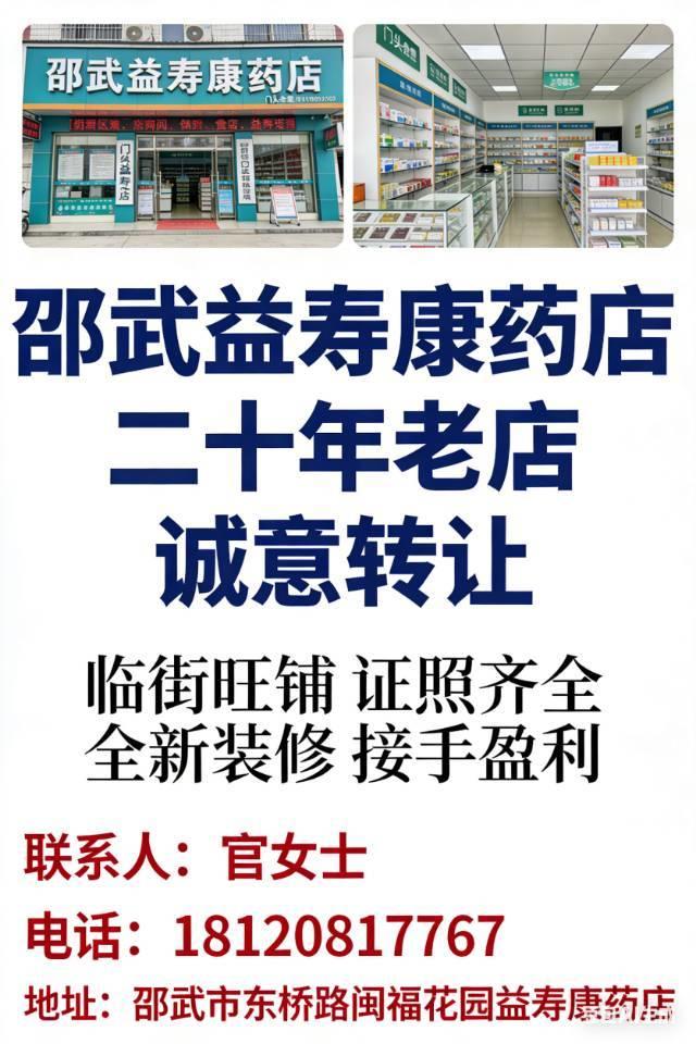 邵武市益寿康药店(二十年老店)诚意转让,店铺位于东桥路闽福花园,临街旺铺、位置优越,周边社区密集,客流稳定,现正常经营中。