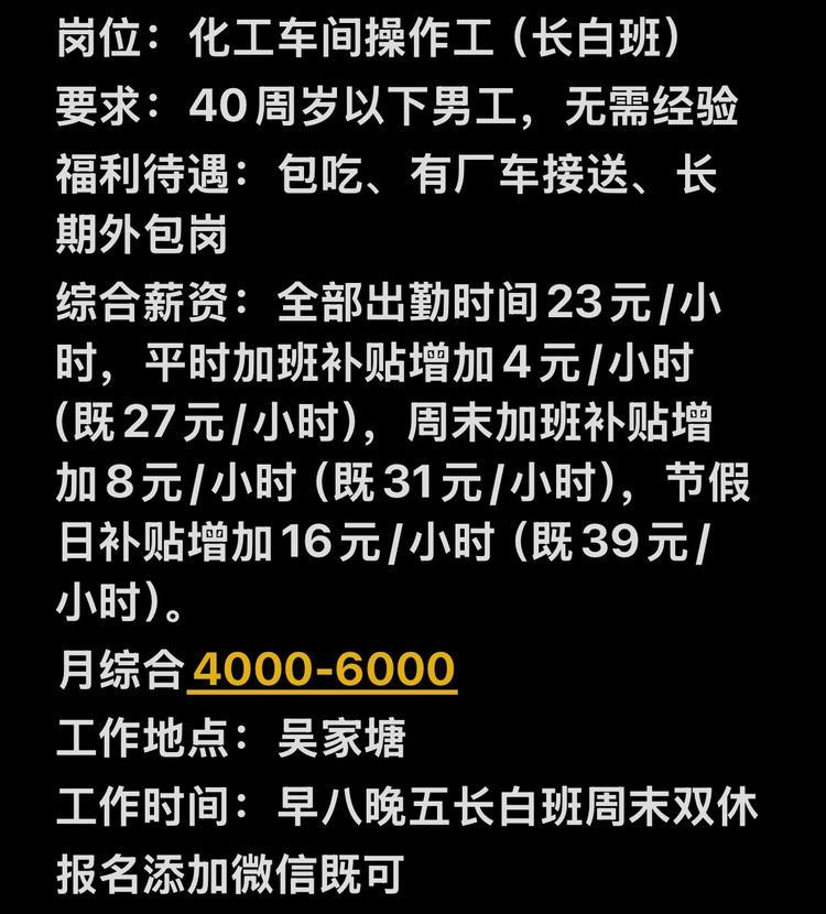 ¿ª¹¤À²£¬Îâ¼ÒÌÁÕг¤°×°à²Ù×÷¹¤¡¢³¤°×°à²æ³µ¹¤£¬ÔÂ×ÛºÏ4000-6000