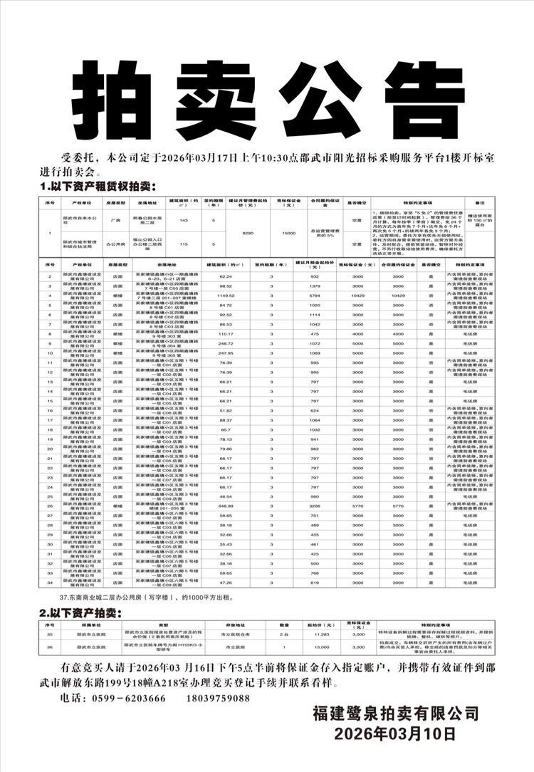 ÊÜίÍУ¬±¾¹«Ë¾¶¨ÓÚ2026Äê03ÔÂ17ÈÕÉÏÎç10:30µãÉÛÎäÊÐÑô¹âÕбê²É¹º·þÎñƽ̨1Â¥¿ª±êÊÒ½øÐÐÒÔÏÂ×ʲú×âÁÞȨÅÄÂô£º1.¸£É½¡¢Îõ´ºÉ½²èÎÄ»¯¿Õ¼äµÄ¾ÓªÊ¹ÓÃȨ¡£2.Îâ¼ÒÌÁÕòöÎÌÁÐ¡ÇøÒ»ÆÚöÎÌÁ·6-20¡¢6-21µêÃæ£¬ËÄÆÚ7ºÅÂ¥Ò»²ãC05µêÃæ¡¢¶þ²ã201-207ÊÒȹ¥£¬8ºÅÂ¥C01-C03µêÃæ£¬9ºÅÂ¥303-305ÊÒ£¬ÎåÆÚ1ºÅÂ¥Ò»²ãC01-C06µêÃæ£¬3ºÅÂ¥Ò»²ãC01-C09µêÃæ£¬3ºÅ¥ȹ¥201-205ÊÒ£¬ÁùÆÚ5ºÅÂ¥Ò»²ãC02-C09µêÃæ¡£3.¶«ÄÏÉÌÒµ³Ç¶þ²ã°ì¹«Ó÷¿£¨Ð´×ÖÂ¥£©£¬Ô¼1000ƽ·½³ö×â¡£ÒÔÏÂ×ʲúÅÄÂô£º1.ÉÛÎäÊÐÁ¢Ò½Ôº±¨·Ï´¦ÖÃ×ʲúÉæ¼°µÄ²ÐÓà¼ÛÖµ£¨2Ì×Ò½ÓøßѹÑõ²Õ£©ÅÄÂô£¬2ÉÛÎäÊÐÁ¢Ò½Ôº ÃöH155KG³µÁ¾ 1Á¾ÅÄÂô¡£